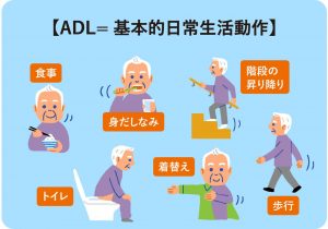 ADL(日常生活動作)とは、Activities of Daily Livingの略で、日常生活を送るために最低限必要な日常的な動作のことです。
