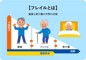 フレイルとは、『加齢とともに、心身の活力(例えば筋力や認知機能等)が低下し、生活機能障害、要介護状態、そして死亡などの危険性が高くなった状態』のことです。