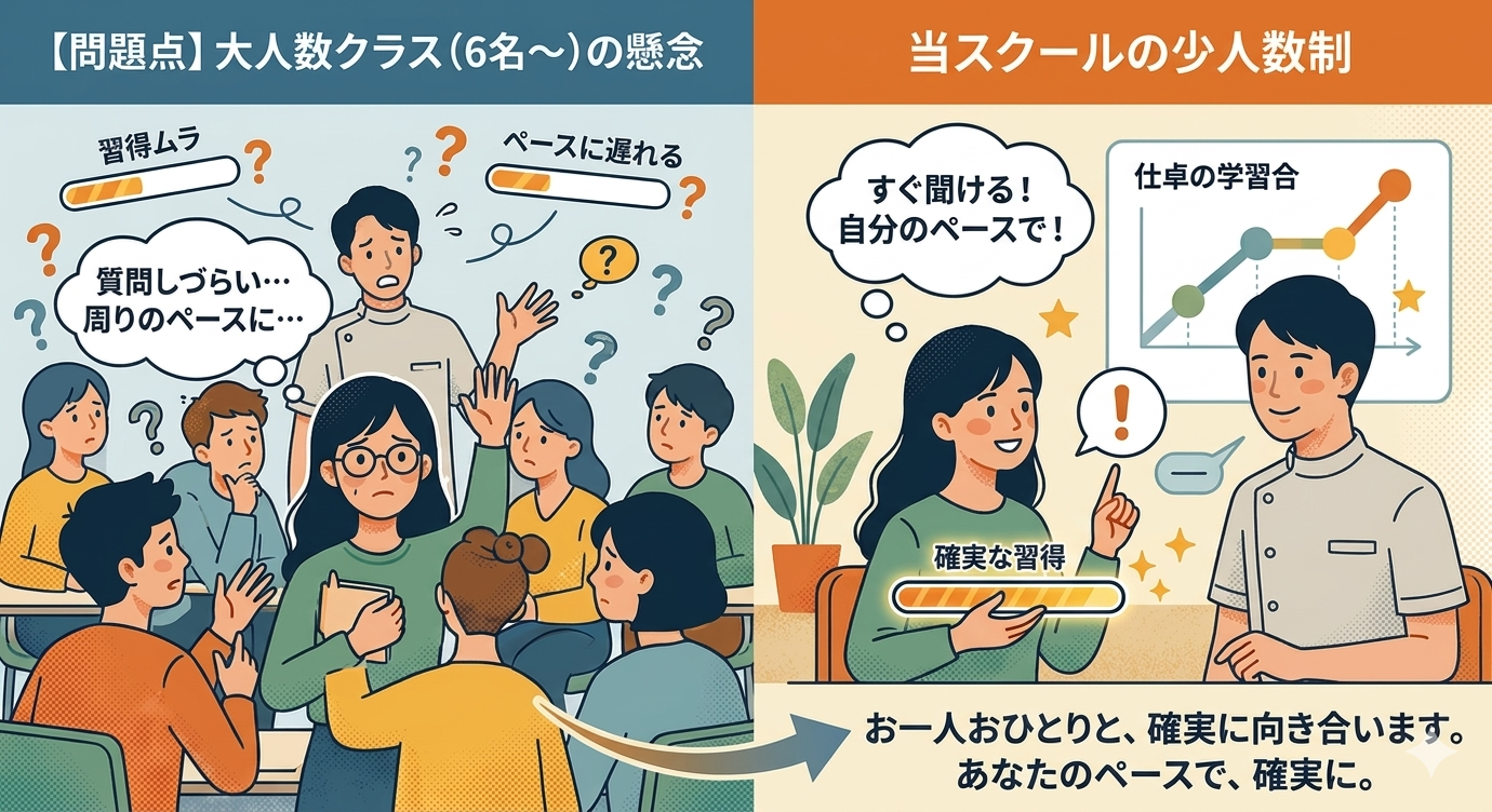 「大人数の講座を受講したけど、先生の指導が分散して身に付かなかった・・・」、「分からないことが、聞きたい時に聞けなかった」という方もいらっしゃいましたが、当スクールの少人数の講座ならしっかりと身に付きます!